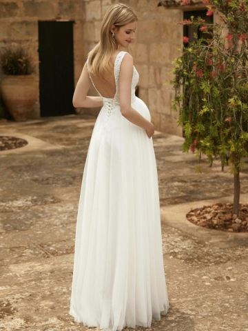 Pokud byste měla mít svatbu až v 8. nebo 9. měsíci, čekáte dvojčata, nebo máte prostě už hodně velké bříško, máme k dispozici i těhotenské svatební šaty. Při prvním těhotenství je bříško často menší, než při těch dalších. Obecně ale i tak platí, že v šestém měsíci ještě těhotenské šaty mít nemusíte. Stačí trochu upravit klasické svatební šaty. Můžete tak vybírat z většiny našich svatebních šatů, kromě těžkých a hodně vyztužených modelů a šatů korzetových - korzet by totiž tlačil na bříško.