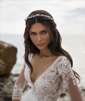 Boho svatební šaty Pronovias Miller se splývavou tylovou sukní s krajkovými aplikacemi do ztracena. Transparentní živůtek nádherně vyšívaný bavlněnou boho krajkou, s výstřihem do prohloubeného V a s tříčtvrtečními rukávy. Velmi slušivý model, který zdůrazní všechny ženské přednosti.