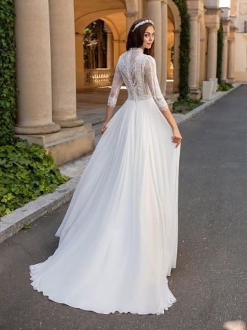 Splývavé boho šaty Pronovias Mimosa s rozevlátou, bohatě řasenou šifonovou sukní. Transparentní živůtek z měkké bavlněné krajky se stojáčkem a tříčtvrtečním rukávkem.