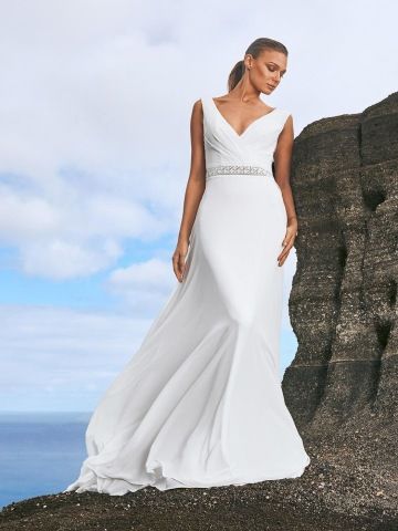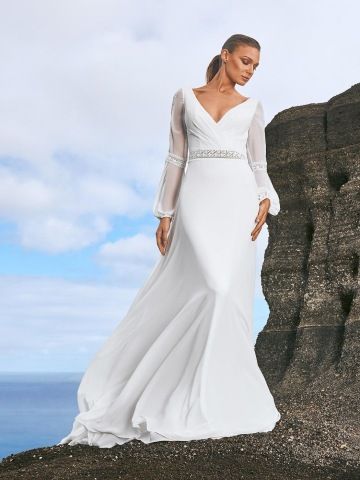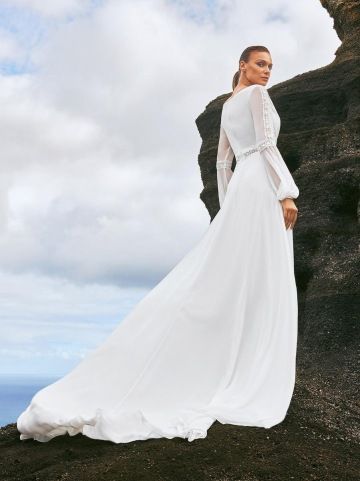 Boho svatební šaty Pronovias Tengger se splývavou sukní z rozevlátého šifonu. Velmi zajímavý, netradičně řešený živůtek s překříženými pásy jemně řaseného šifonu opticky zeštíhlí postavu.