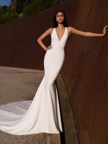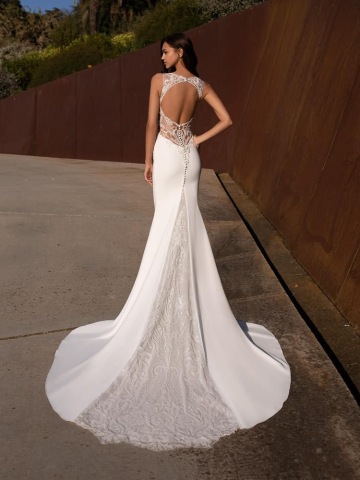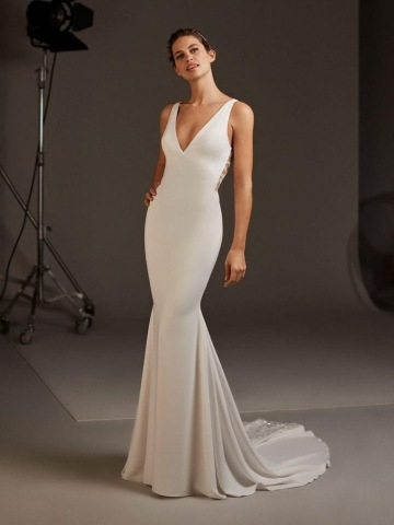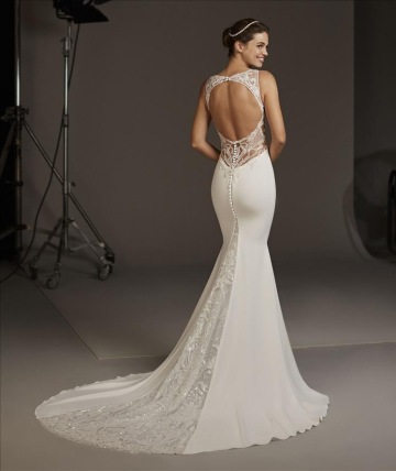 Luxusní elegantní svatební šaty Pronovias Aquila s úzkou splývavou sukní a hladkým minimalistickým předním dílem s výstřihem do V. Netradiční prvek zadního vyšívaného dílu s 3D efektem flitrových ornamentů se zdobenou vlečkou.