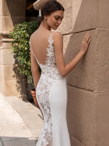 Luxusní elegantní svatební šaty Pronovias Iocaste s úzkou splývavou sukní a hladkým minimalistickým předním dílem s výstřihem do V. Pohodlné nošení díky elastické sukni a podšívce.