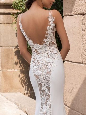 Netradiční prvek zadního krajkového dílu s 3D efektem díky tělové podšívce a zdobenou vlečkou. Velmi moderní a rafinovaný kousek pro nevěsty, které chtějí být sexy a zároveň elegantní.