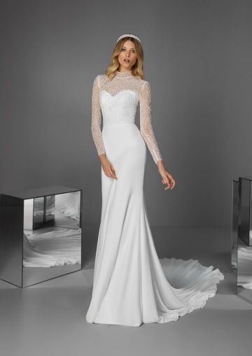 Velice elegantní, nadčasové a zároveň sexy. Šaty je možné zapůjčit dohromady s pláštěm i samostatně, doplnit o tenká ramínka, spadená ramínka, zdobený pásek, nebo například některý z Pronovias topů - Adelpha, Suki nebo Reverie.