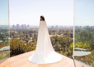 Hladké svatební šaty z měkkého, mírně pružného krepu s originálním elegantním pláštěm na ramena. Hladký minimalistický vzhled. Velmi rafinované, precizně vypracované korzetové šaty ve střihu volnější mořské panny.
