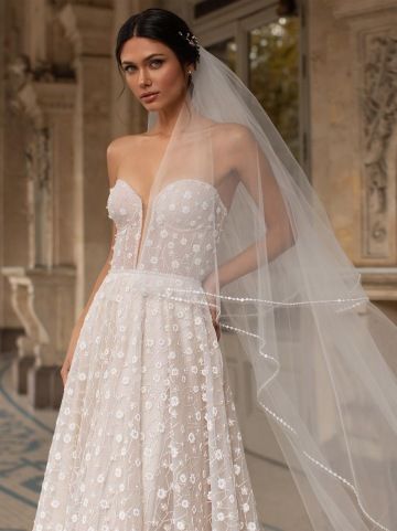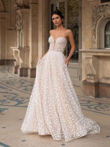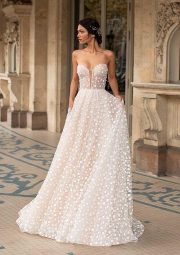 Možnost přidat k šatům špagetová nebo spadená ramínka. Volitelný objem sukně přidáním spodničky s kruhem nebo bez. Něžný a romantický třpytivý model pro moderní princezny.