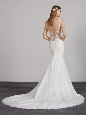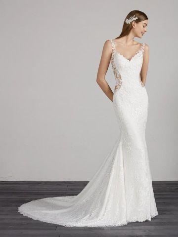 Krajkové svatební šaty Pronovias Morocco ve stylu mořské panny s trendovým prvkem illusion průstřihů na bocích a v pase. Hluboký illusion výstřih na zádech nádherně zdobený krajkou opticky vyštíhluje pas a protahuje postavu. Velmi slušivý model, který zdůrazní všechny ženské přednosti.
