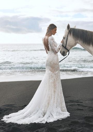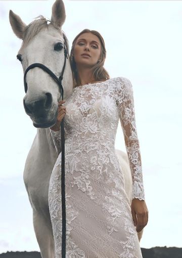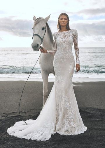 Romantické boho svatební šaty Pronovias Panjin s dlouhým, mírně nabraným rukávem a hlubokým výstřihem na zádech.