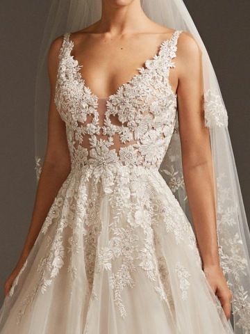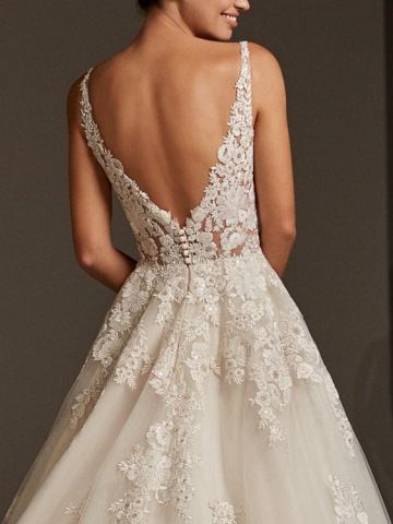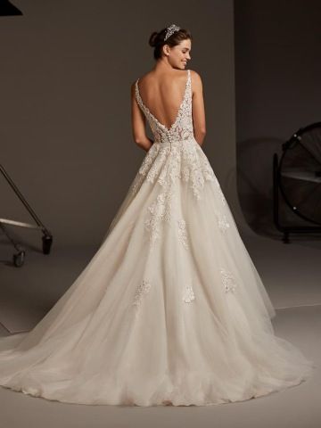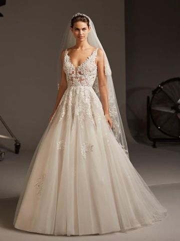 Romantické svatební šaty Pronovias Ariel s áčkovou sukní a nádherně vyšívaným živůtkem do V. Transparentní živůtek s tělovými vyztuženými košíčky.