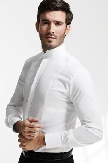 Svatební košile by měla být slavnostní verze společenské košile – s ohrnovací manžetou na manžetové knoflíčky, krytou légou (látkovou lištou přes knoflíky), a především v odstínu šatů nevěsty. V našich salonech nabízíme svatební košile, které barevně odpovídají k našim šatům.