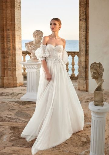 Směle ženské svatební šaty bez ramínek Pronovias Bloom v áčkové linii. Jemně řasený korzet a lehká nabíraná tylová sukně jsou dokonale vyváženy něžnými 3D krajkovými květy s třpytivými detaily. Odnímatelné průsvitné rukávy dotvářejí romantický vzhled a dají se k šatům zapůjčit zvlášť.