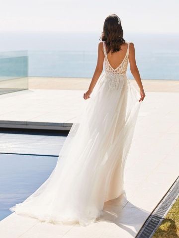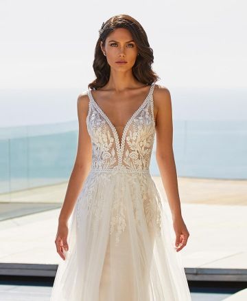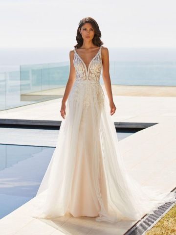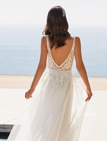 Luxusní romantické svatební šaty Pronovias Brie s liniovou splývavou sukní zdobené pravou španělskou krajkou s motivy klasů, lístečků a větviček. Živůtek na tenká ramínka s odhalenými zády. Horní tylová sukně s rozparkem je k šatům zvlášť.