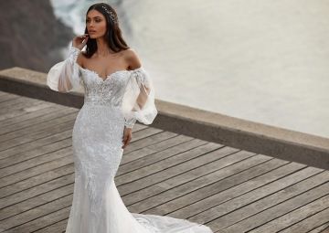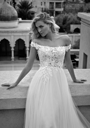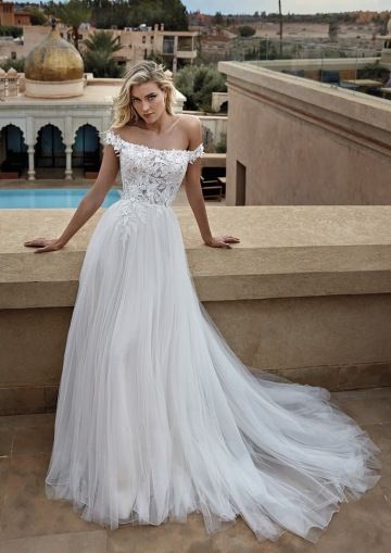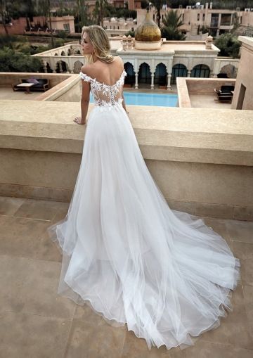 Luxusní romantické svatební šaty Pronovias Chiloe s áčkovou splývavou sukní z jemného padavého tylu. Elegantní a smyslný živůtek s nápadným designem s hlubokým výstřihem na zádech s průhlednou krajkou zdobenou 3D květinovou aplikací se spadenými ramínky.