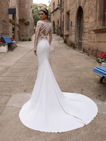 Úzké svatební šaty Pronovias Pasiphae se sukní z mírně elastického krepu s trendovým prvkem snížených illusion průstřihů na bocích.