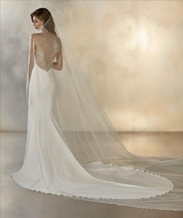 Tyto úchvatné svatební šaty Atelier Pronovias Galaxy jsou jednoduché a přesto opravdu velkolepé. Elegantní přiléhavý živůtek ke krku, který kopíruje postavu a rozlévá se do okouzlující dlouhé vlečky.