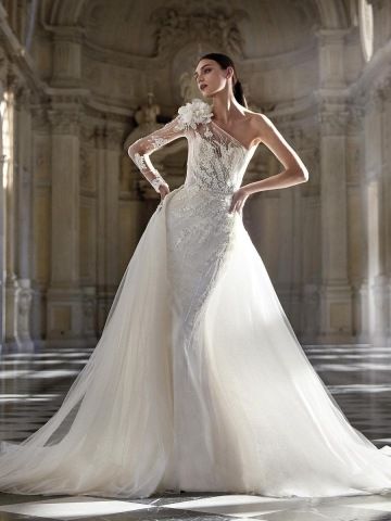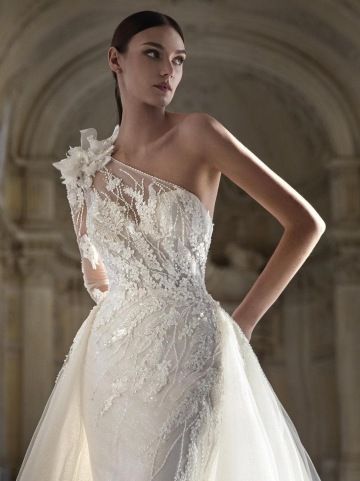 Dechberoucí svatební šaty Pronovias Privée Agatia ve střihu mořské panny. Horní část těla s asymetrickým výstřihem na jedno rameno zdobená oslnivými korálky a 3D květinou na rameni. Kontrastní sukně je vyrobena z jemných vrstev prémiového glitrového tylu.