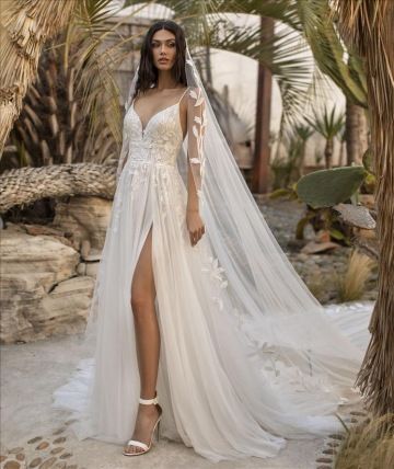 Splývavé éterické šaty Pronovias Anderson s lehoučkou tylovou sukní s rozparkem. Mírně transparentní živůtek z jemně řaseného tylu na špagetová ramínka s hlubokým výstřihem vzadu aplikovaný 3D lístečky a kvítky.