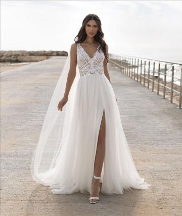Splývavé boho šaty Pronovias Charisse se splývavou sukní s rozparkem. Mírně transparentní živůtek vyšívaný krajkovými aplikacemi z pravé bavlněné boho krajky a paspulkami s výstřihem do V. Vzadu na zapínání za krkem a otevřenými zády ve tvaru srdce. K dispozici varianta s tylovou i se šifonovou sukní s rozparky.