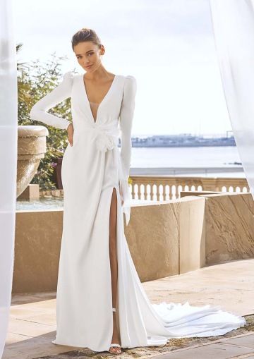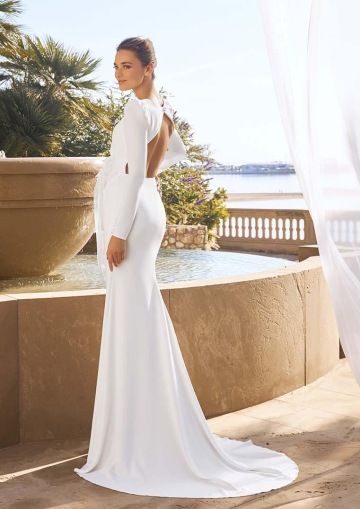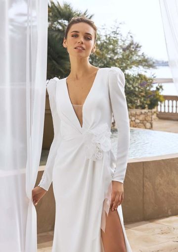 Luxusní elegantní svatební šaty Marchesa for Pronovias Aedan s úzkou splývavou sukní s rozparkem. Hladký minimalistický vzhled s hlubokým výstřihem do V. Jemně nabíraný dlouhý rukáv a výstřih na zádech ve tvaru trojúhelníku. Odepínací květinová brož je k šatům zvlášť - my doporučujeme šaty doplnit tenkým páskem.