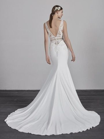 Luxusní elegantní svatební šaty Pronovias Emily s úzkou splývavou sukní a zdobeným transparentním živůtkem s výstřihem do V. Netradiční prvky průsvitných klínů na bocích korespondují s geometrickými tvary výstřihu.