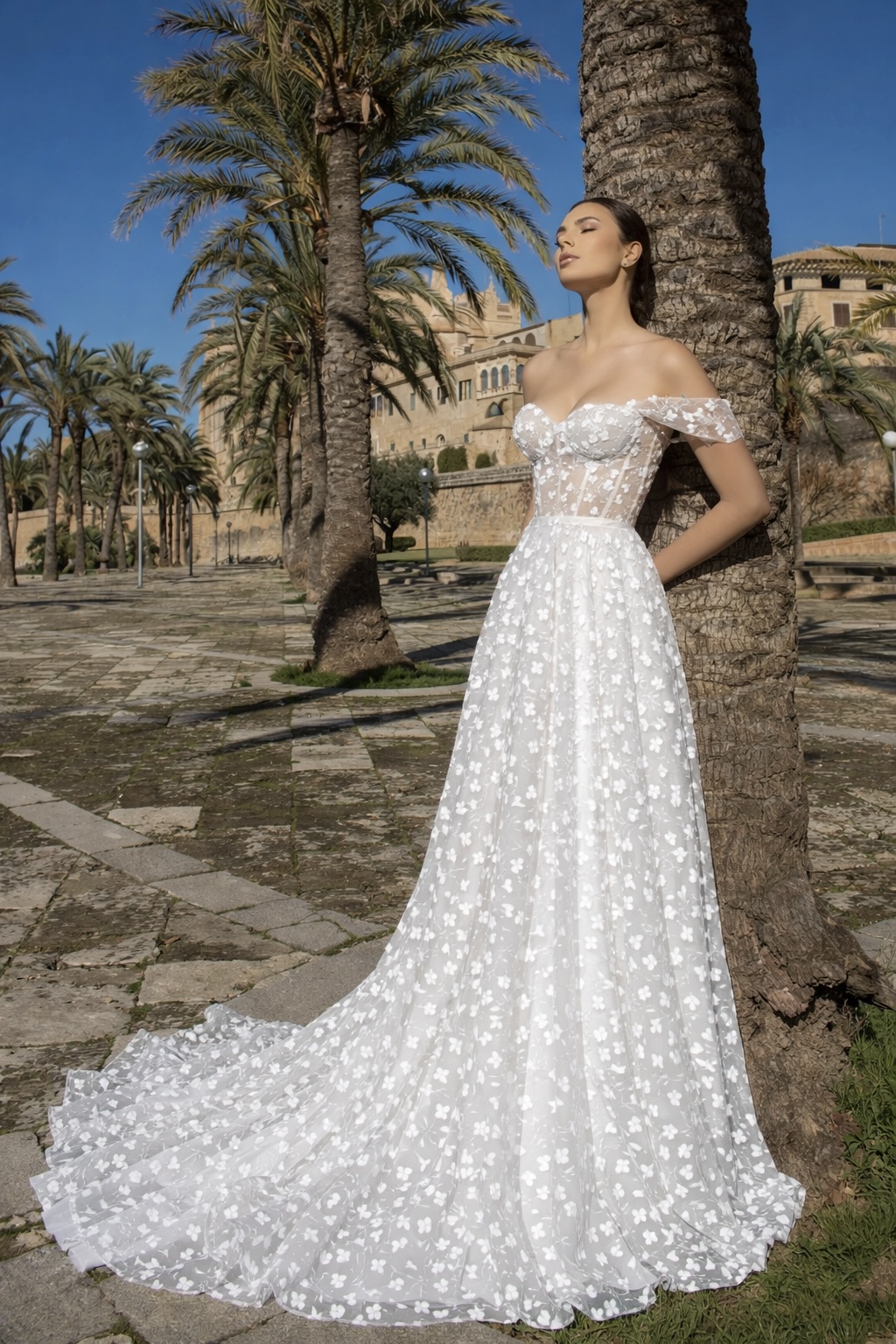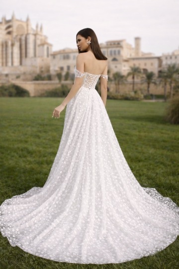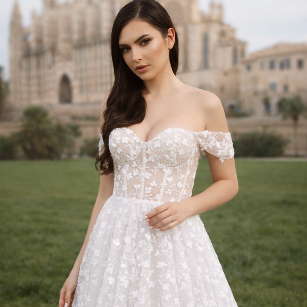 Zažijte glam eleganci s šaty ARTEMIS, úchvatnými princeznovskými šaty s romantickými spadenými ramínky. Tyto úžasné šaty se srdíčkovým výstřihem krásně zdůrazňují dekolt a zároveň vyzařují sofistikovanost. Vypasovaný přiléhavý korzet s vynikající vnitřní strukturou pro dokonale tvarovaný výstřih i pas. Lichotivá áčková sukně z třpytivého tylu s vlečkou. Celé šaty odshora až dolů zdobí sofistikovaný vzor třpytivých lístečků, které ve tmě odrážejí světlo a díky tomu září.