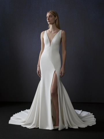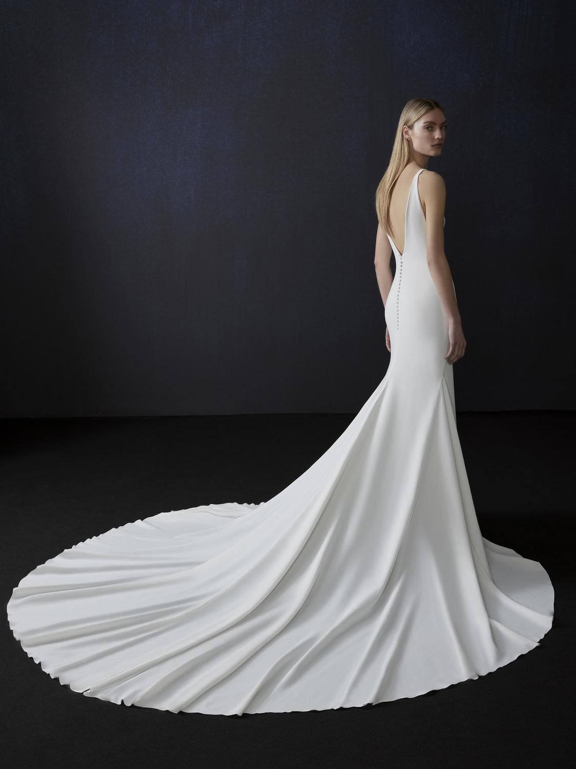 Tento haute couture model Atelier Pronovias BLUE MOON představuje dokonalé propojení minimalismu a svůdnosti. Čisté linie, hladký materiál a hluboký výstřih do V vytvářejí ikonickou siluetu, která působí jako druhá kůže.