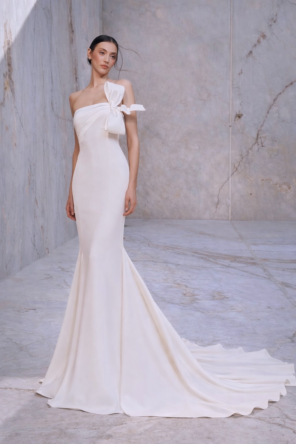 Minimalistické, ale naprosto nezapomenutelné — haute couture svatební šaty BRISEL ztělesňují moderní eleganci v té nejčistší podobě. Hladká silueta z luxusního hedvébného krepu perfektně kopíruje ženské křivky a působí neuvěřitelně sofistikovaně. Asymetrický živůtek s originálním skládáním a výraznou mašlí na rameni dodává šatům couture šmrnc i sochařský rozměr.