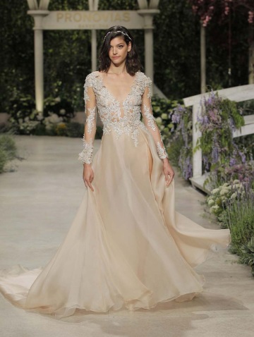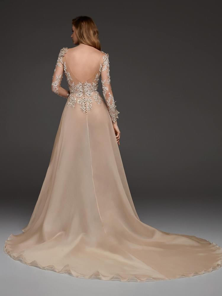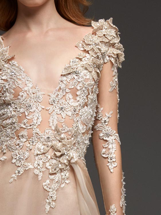 Haute couture model Atelier Pronovias CINDY, který zaujme na první pohled svou smyslností a precizní ruční prací. Sexy živůtek s hlubokým výstřihem do V je bohatě zdobený plastickými krajkovými aplikacemi a zářivými Swarovski elements, které vytvářejí luxusní, třpytivý efekt. Dlouhé přiléhavé rukávy zdůrazňují eleganci a plynule navazují na zdobená ramena. Lehká hedvábná sukně v teplém nude odstínu volně splývá od pasu, má výrazný rozparek a působí mimořádně vzdušně. Záda s hlubokým výkrojem a krajkovými detaily podtrhují ženskou siluetu.