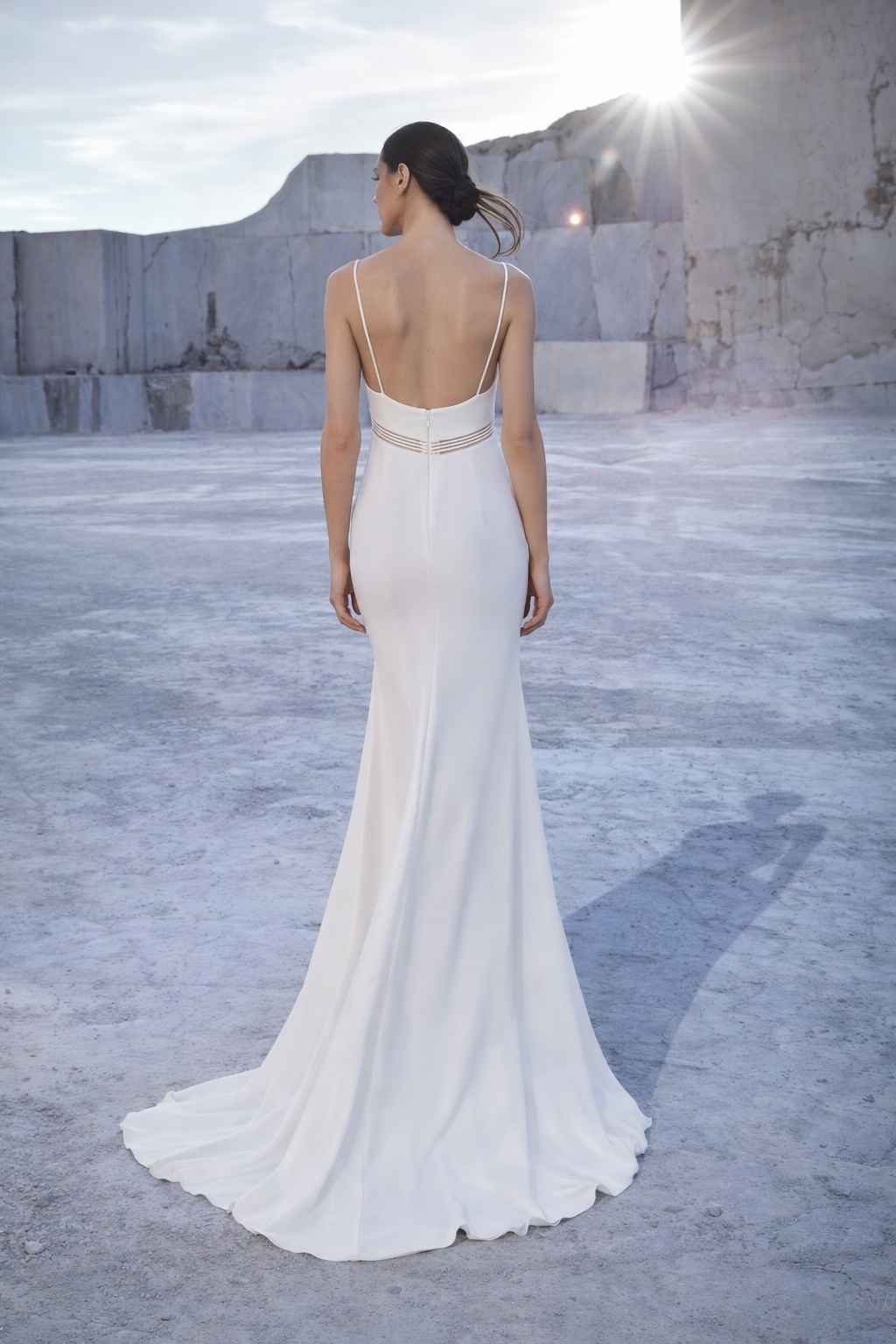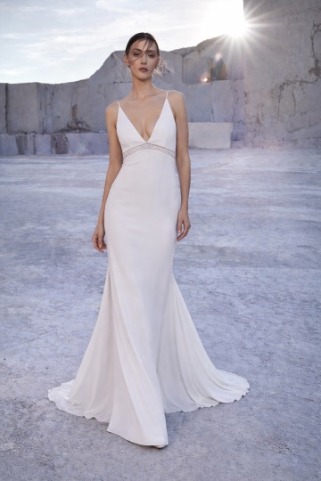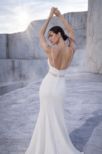Jemné pruhy s decentními krystaly pod prsy vytvářejí optický efekt štíhlejší siluety a dodávají šatům šperk v nejčistší podobě. Zadní část s nízkým výstřihem a jemně rozšířenou sukní z kvalitního krepu podtrhuje lehkost pohybu. Pro moderní nevěstu, která ví, že skutečná krása spočívá v detailu.