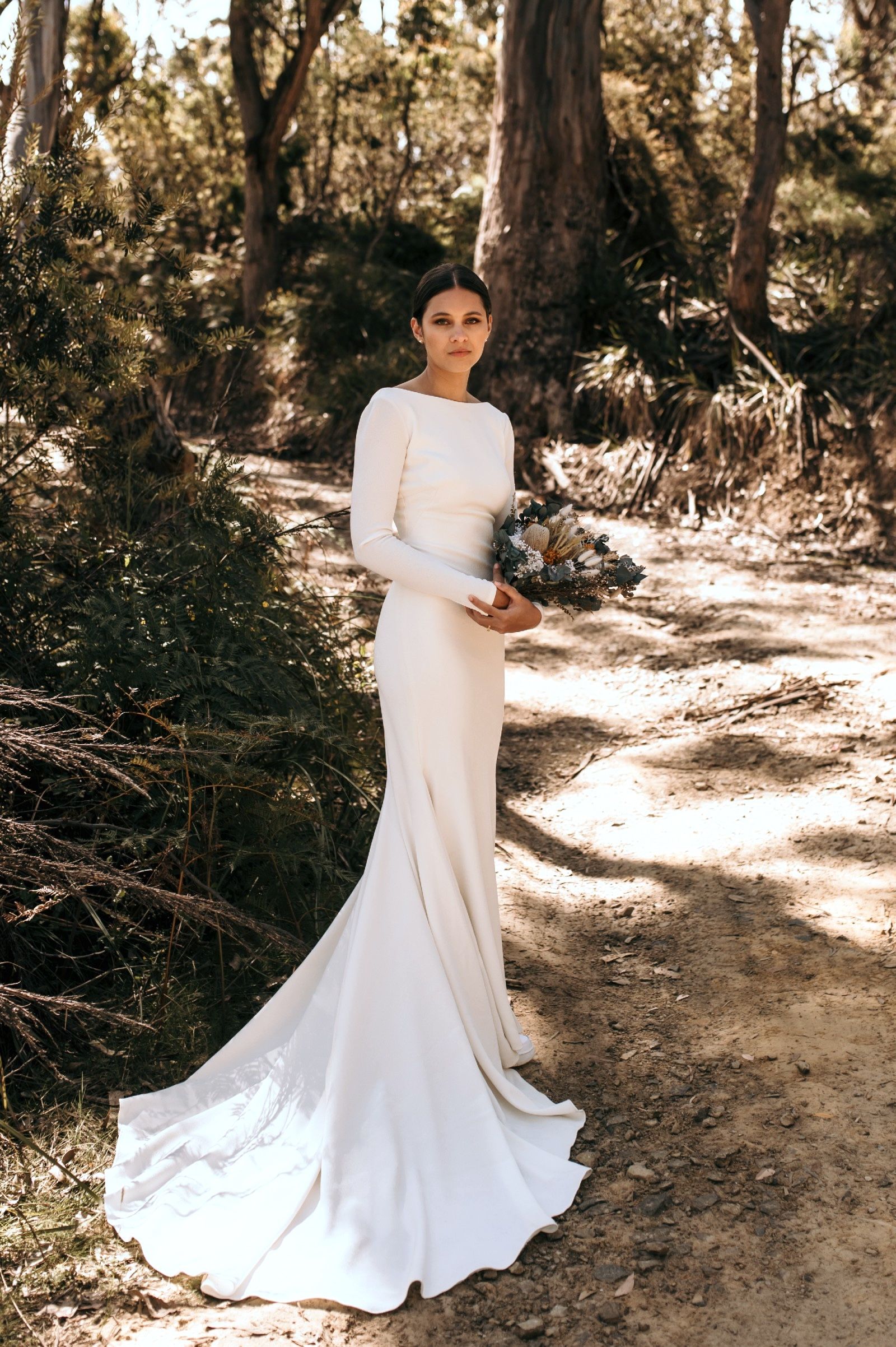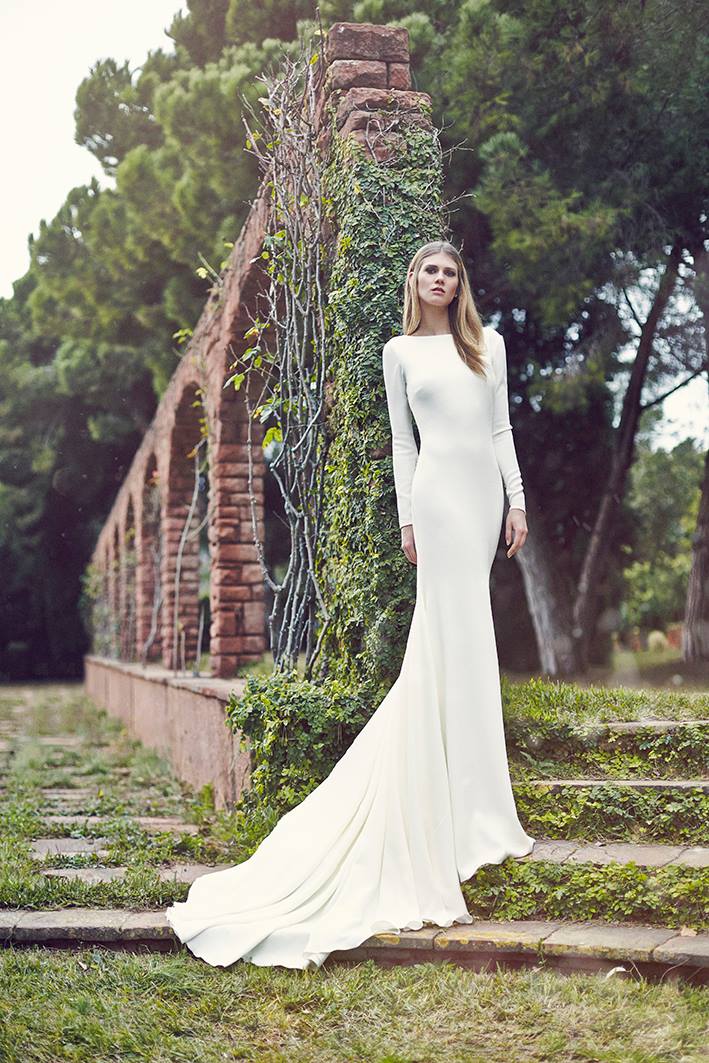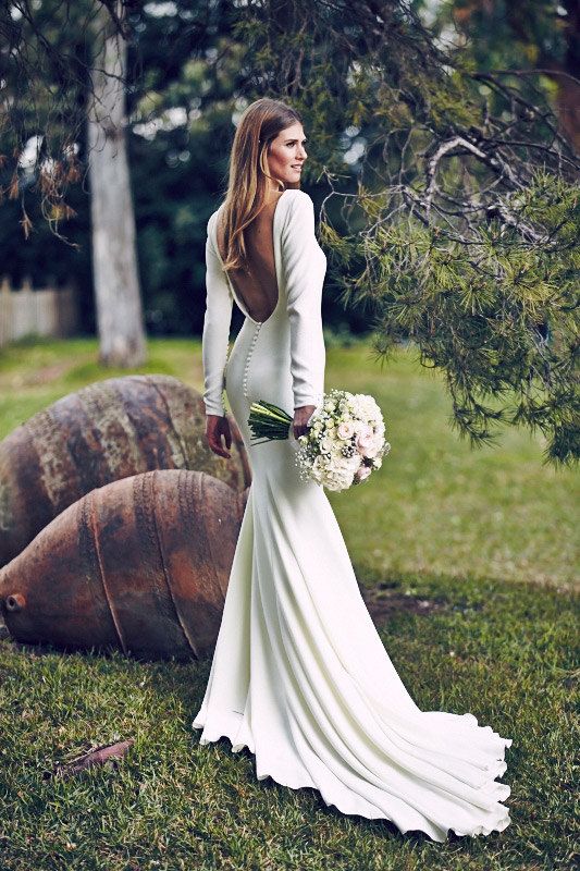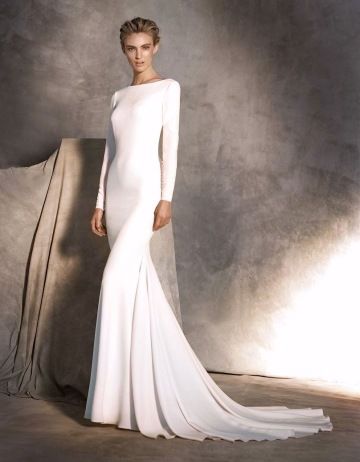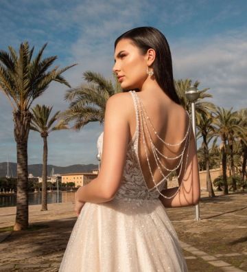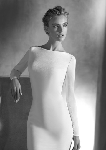 Přední část zaujme minimalistickým lodičkovým výstřihem, zatímco záda ohromí hlubokým výstřihem do tvaru V lemovaným potaženými knoflíčky. Plynule splývavá sukně z krepu přechází do dlouhé vlečky, která dotváří dokonalou rovnováhu mezi jednoduchostí a dramatickým efektem.