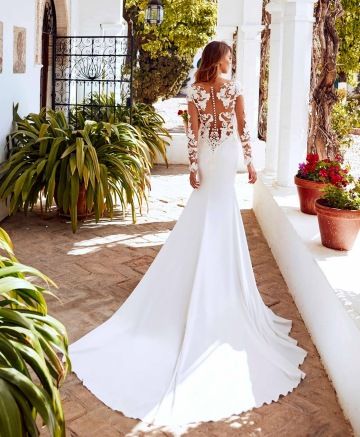 Zadní část šatů zdobí decentní knoflíková léga, která vede až k elegantní hedvábné sukni s rozparkem, jež dodává modelu lehkost a pohyb. Spojení strukturované krajky a splývavého hedvábí působí rafinovaně i přirozeně zároveň.