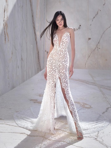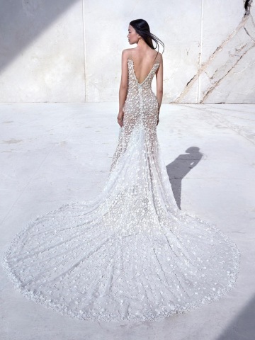 Dlouhá, plynule navazující vlečka z jemně strukturované krajky vytváří při pohybu dramatický efekt a završuje couture vzhled šatů. VERDANT jsou ideální volbou pro nevěsty hledající výjimečný, odvážný a vysoce módní model s důrazem na detail, siluetu a luxusní zpracování.