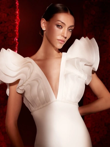 Tyto luxusní haute couture svatební šaty, které jsou součástí ekologicky udržitelné řady „We Do Eco“, jsou vyrobeny z měkkého ekologického krepu s výraznými volánky na živůtku z čisté organzy. Mají illusion výstřih ve tvaru V vepředu i vzadu, přiléhavý střih v empírovém stylu, který prodlužuje postavu, a jsou zakončeny jemnými knoflíčky na zádech.