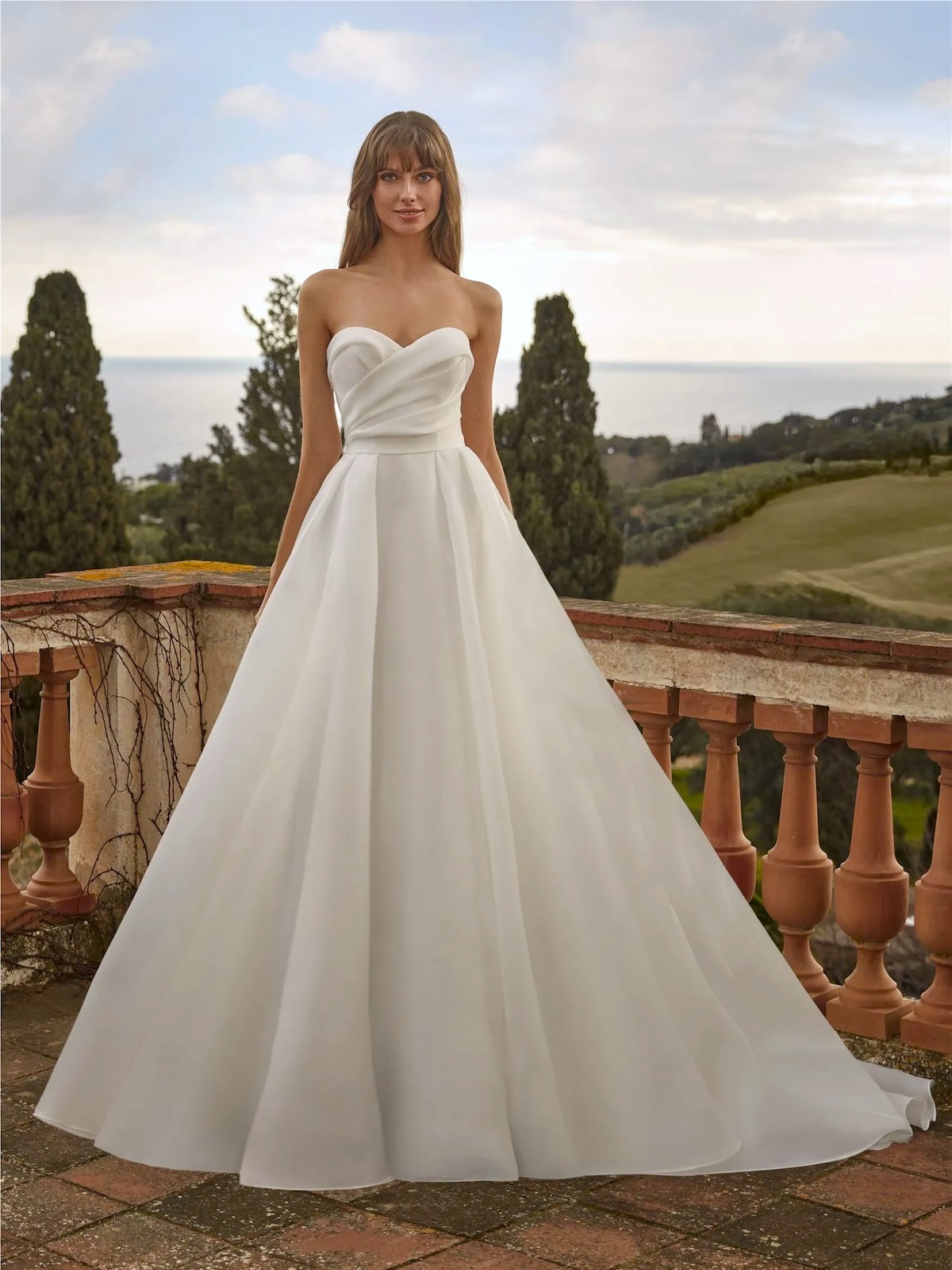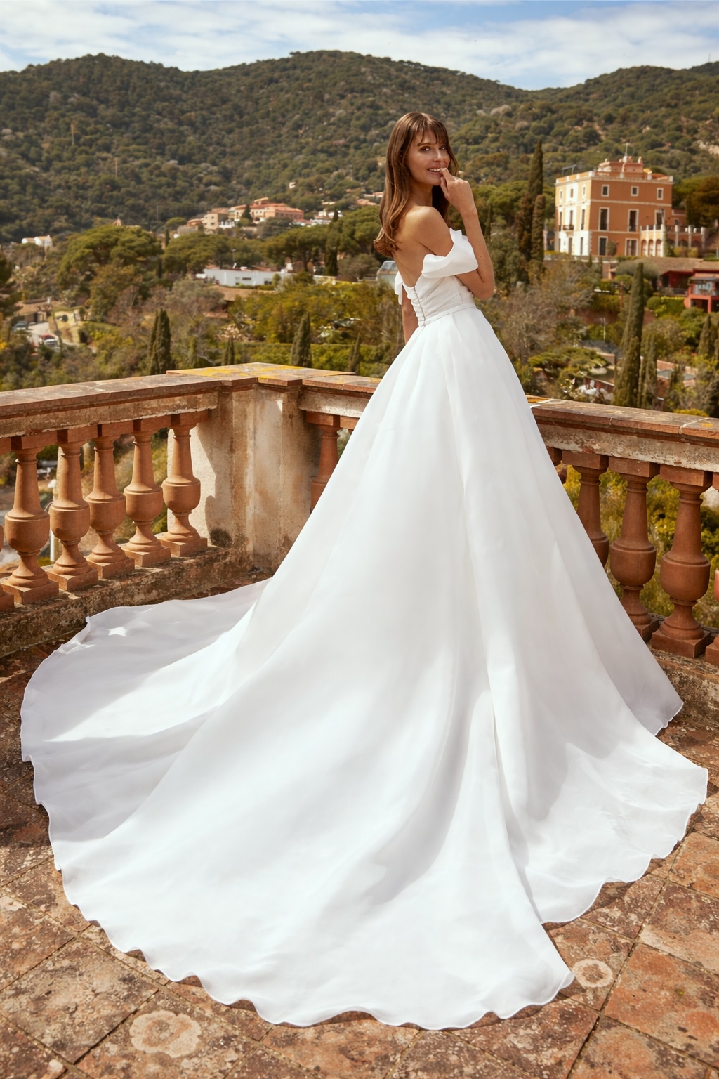 CLIPA jsou svatební šaty, které pracují s čistou linií korzetového živůtku a jemnou architekturou střihu. Hladký živůtek s měkce tvarovaným srdíčkovým výstřihem krásně formuje dekolt a přirozeně zvýrazňuje pas, ze kterého se rozevírá lehká organzová sukně s plynulým splýváním. Minimalistické zpracování dává vyniknout proporcím a pohybu látky – šaty působí velmi ženským, klidným a nadčasovým dojmem.