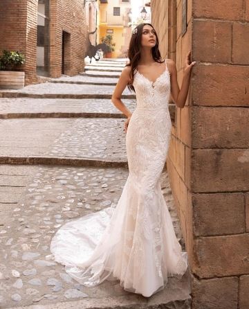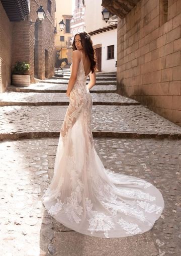 Luxusní sexy svatební šaty Pronovias ALBIORIX ve střihu mořské panny, které elegantně zvýrazňují ženskou siluetu. Přiléhavé glamour šaty na tenká ramínka ohromí propracovanými aplikacemi z netradiční krajky. Nádherná zdobená vlečka v praktické střední délce je krásně lehoučká. Velmi moderní a rafinovaný kousek pro nevěsty, které chtějí působit sebevědomě a sexy.