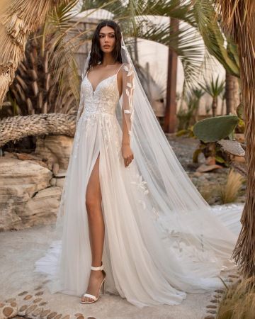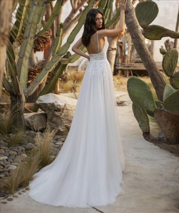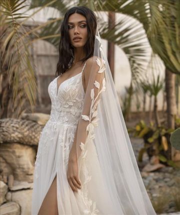 Splývavé éterické svatební šaty Pronovias ANDERSON s lehoučkou tylovou sukní se sexy rozparkem. Mírně transparentní živůtek z jemně řaseného tylu na špagetová ramínka s hlubokým výstřihem vzadu. Živůtek i sukně jsou zdobené něžnými 3D aplikacemi s motivem listů. Lehké boho svatební šaty, které se skvěle hodí na letní svatbu v přírodě.
