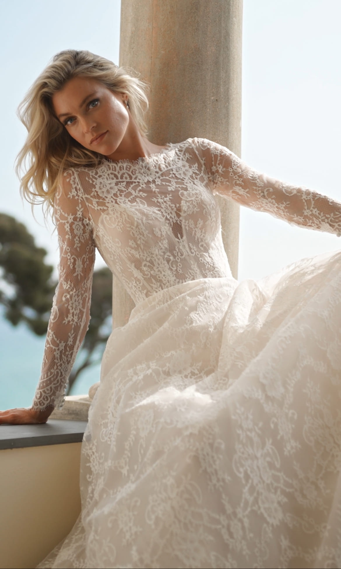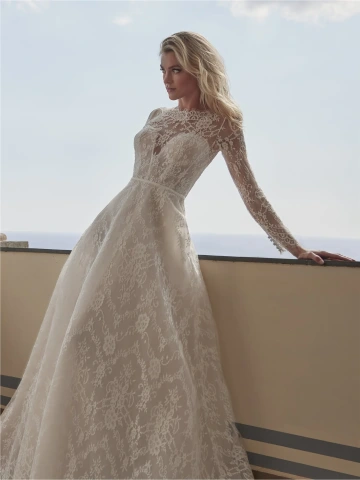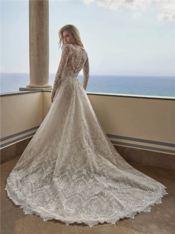 Svatební šaty ATI patří mezi sofistikované modely, které v sobě nesou romantickou jemnost díky měkké a jemné krajce chantilly. Halenkový krajkový živůtek s dlouhými rukávy působí elegantně a nadčasově, zatímco jemná průsvitnost krajky dodává šatům ženský šarm. Vzdušná áčková sukně s vlečkou je praktická a pohodlná, přesto ale působí slavnostně a majestátně.