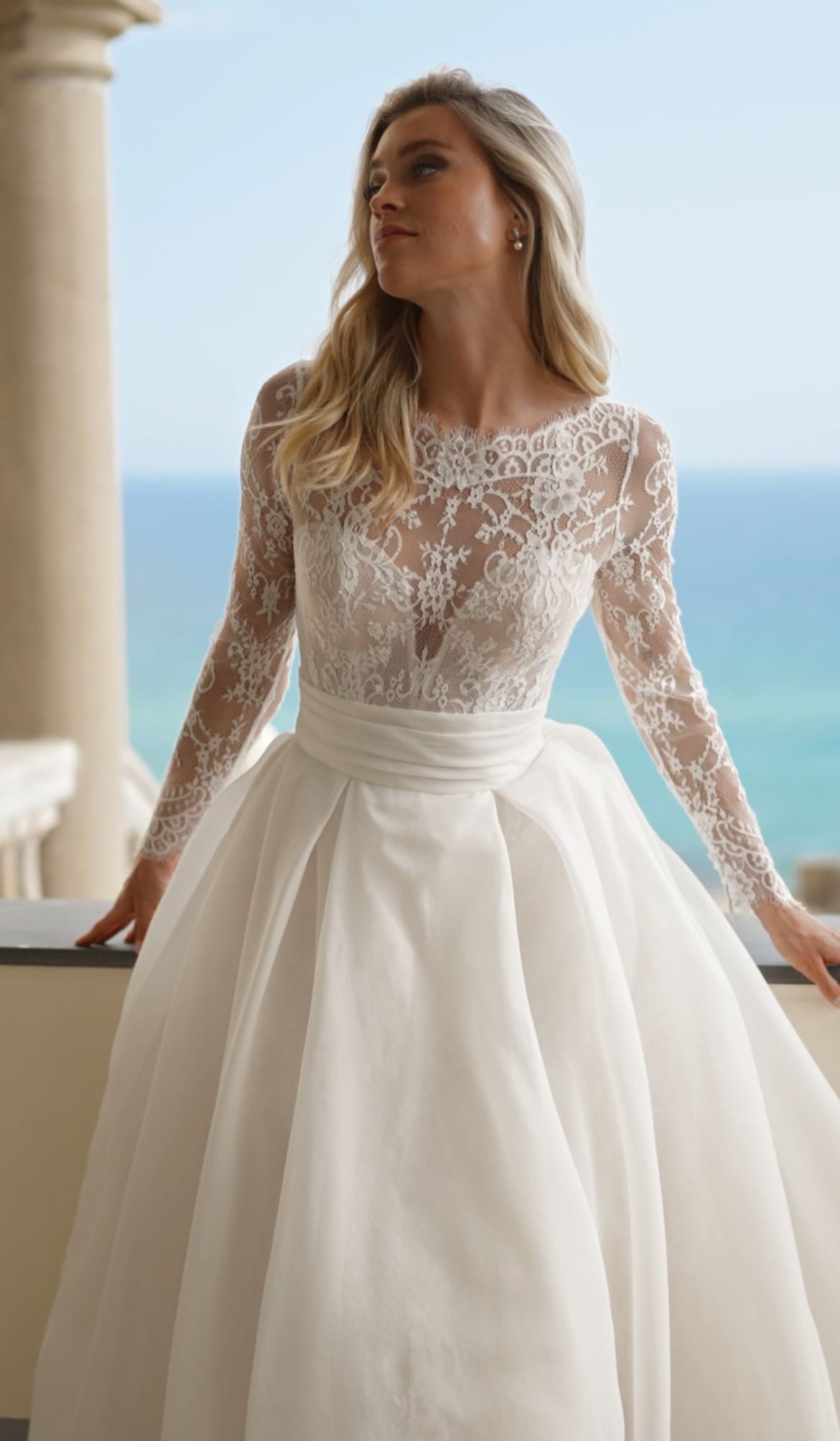 Svatební šaty ATI patří mezi sofistikované modely, které v sobě nesou romantickou jemnost i moderní variabilitu. Halenkový krajkový živůtek s dlouhými rukávy působí elegantně a nadčasově, zatímco jemná průsvitnost krajky dodává šatům ženský šarm.