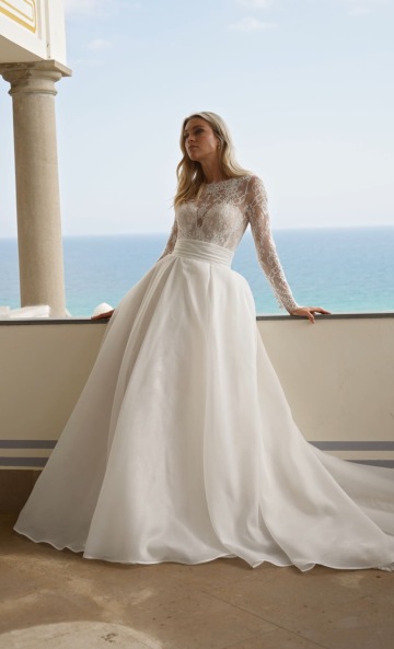 Tento model je však výjimečný hlavně svou proměnlivostí – k šatům lze přidat odepínací overskirt, která okamžitě vytvoří velkolepý princess look s objemnou sukní. Po jejím odejmutí zůstávají šaty vzdušnější a praktičtější, ideální třeba na večerní oslavu.