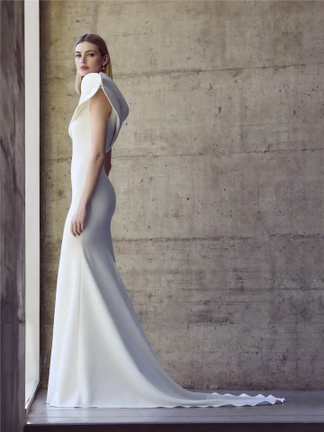 Představujeme model Pronovias BALS, okouzlující minimalistické šaty střihu mořské panny, které vzdávají hold klasické eleganci s moderním nádechem. Ústředním bodem této róby je její nápadný asymetrický výstřih s odvážnou a elegantní šerpou v umelěckém couture stylu.