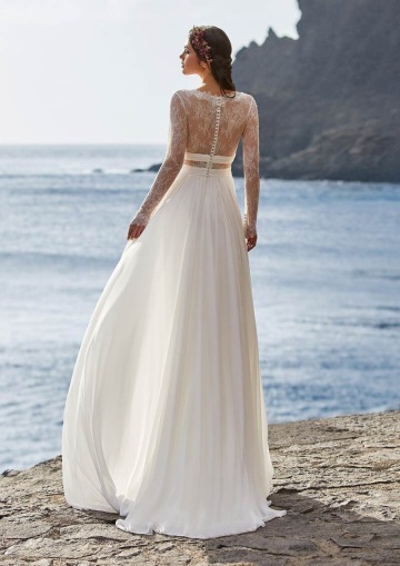 Svatební šaty BARRY zaujmou lehkostí, jemností a bohémsky romantickým charakterem. Éterická, jemně řasená šifonová sukně se ve vánku krásně vlní a působí mimořádně vzdušně. Živůtek je tvořen hlubokým výstřihem do V, lemovaným jemnou krajkou, která plynule přechází do transparentních dlouhých rukávů. Výrazným prvkem je také jemně zvýrazněný pas a krajková záda s řadou potažených knoflíčků, které dodávají modelu ženskost a sofistikovanost. Romantické svatební šaty pro lehkou a přirozenou nevěstu, ideální pro svatbu u moře, v přírodě i na zahradě.