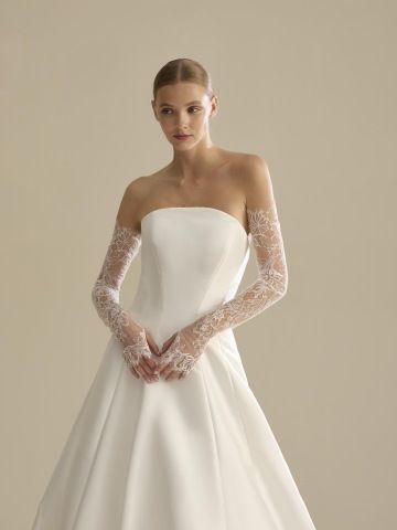 Šaty lze nosit se snímatelným krajkovým topem pro decentní svatební obřad nebo samostatně pro večerní oslavu – dvě podoby jedné dokonalé nevěsty.