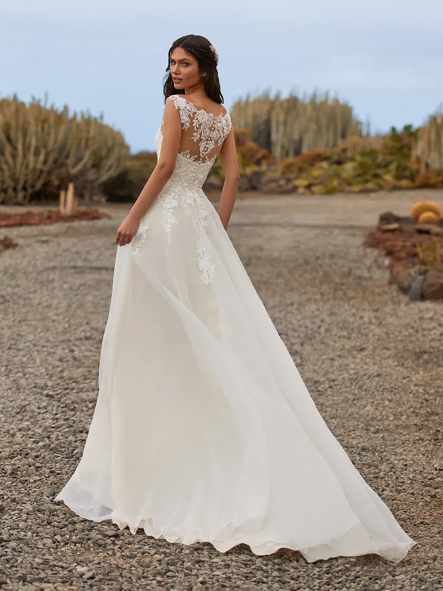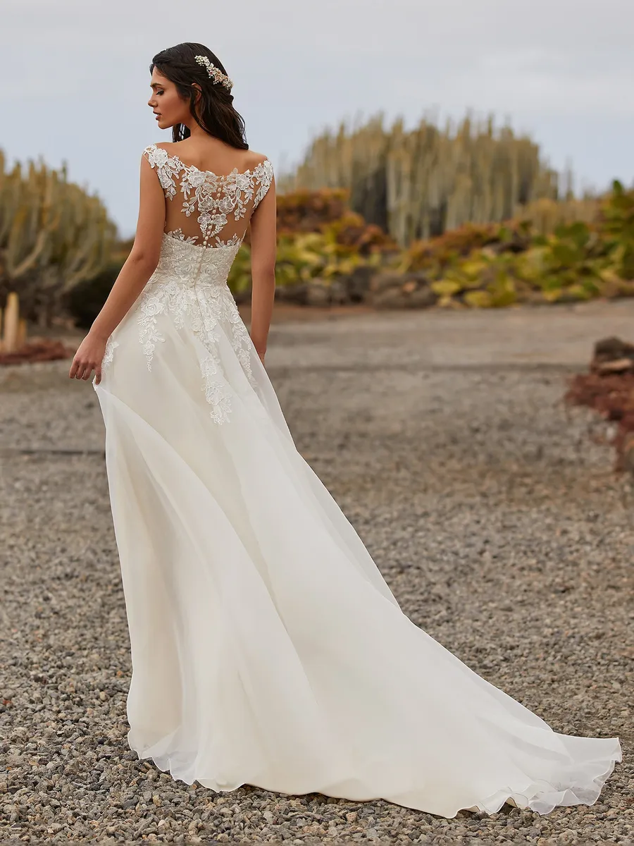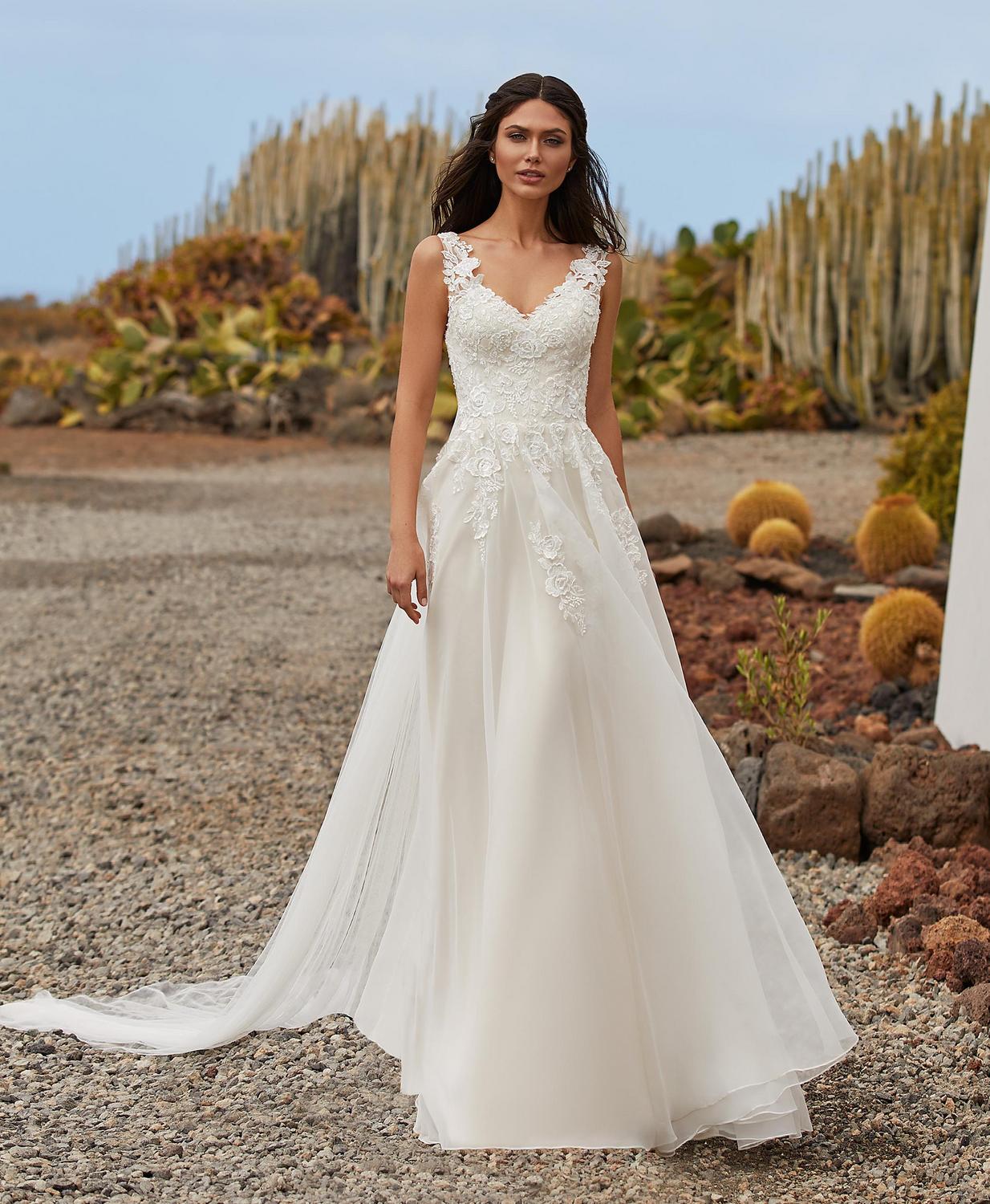 Vzdušná organzová sukně v áčkovém střihu splývá s lehkostí a vytváří plynulý pohyb při chůzi. Šaty jsou navrženy s důrazem na komfort, lichotivé proporce a přirozený půvab – ideální volba pro nevěsty, které chtějí romantický vzhled bez kompromisů.