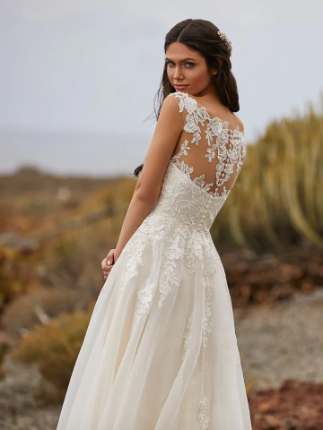 Svatební šaty BLYTHE jsou důkazem, že lehkost, romantika a perfektní střih mohou jít ruku v ruce i v plus size provedení. Jemně vyšívaný krajkový živůtek s výrazně tvarovaným pasem krásně zvýrazňuje siluetu, zatímco transparentní záda s bohatou krajkou dodávají modelu ženskost a eleganci.