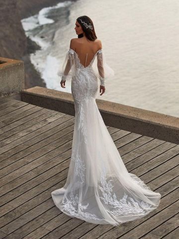 Romatické svatební šaty Pronovias CHERYL s úzkou sukní ve střihu mořské panny aplikované pravou španělskou krajkou s netradičním abstraktním motivem. Velmi moderní střih pro nevěsty, které chtějí být sexy & trendy.