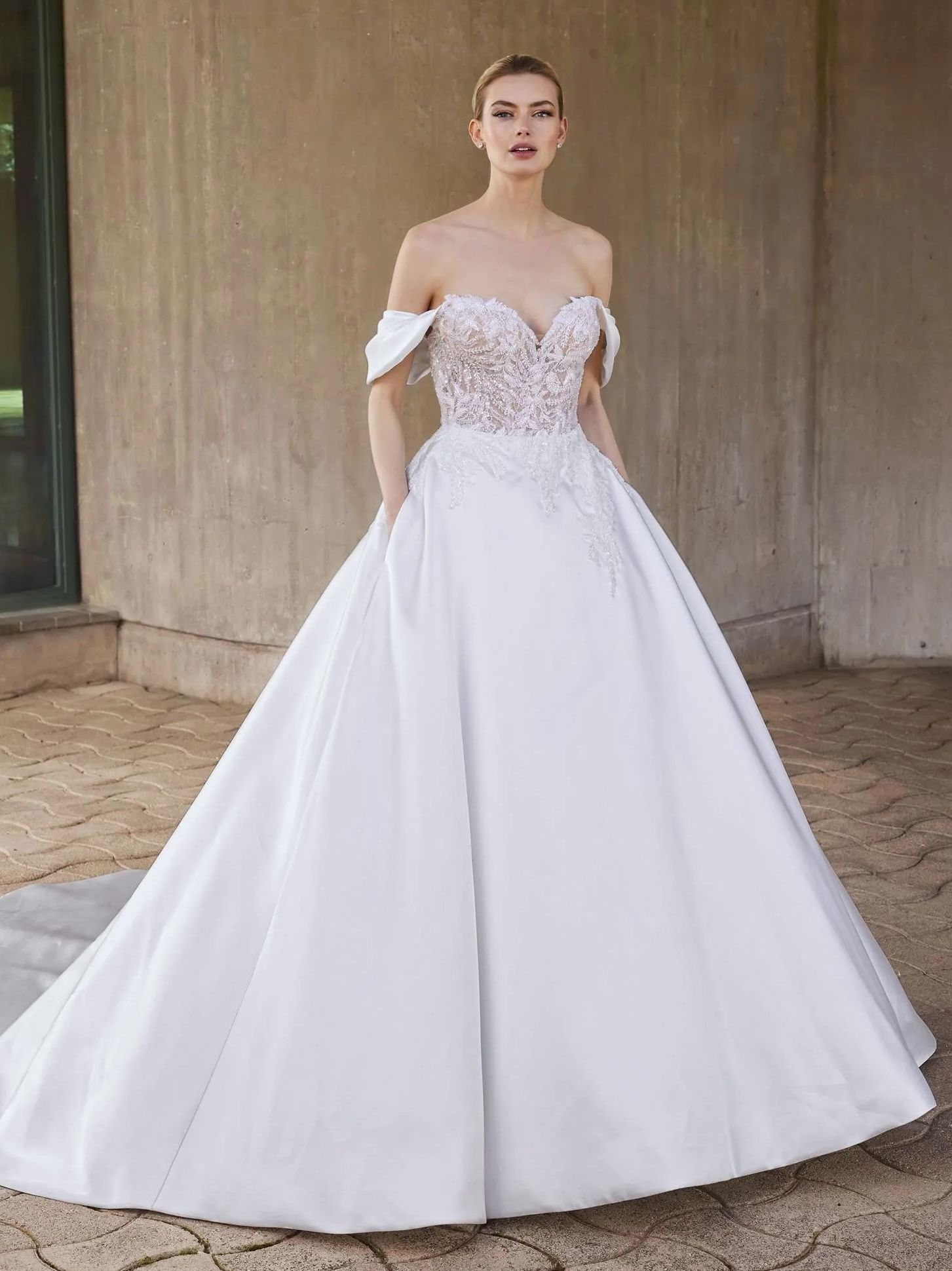 Šaty CHILLS přinášejí dechberoucí spojení luxusu a romantiky. Korzet s jemným srdíčkovým výstřihem je bohatě vyšívaný třpytivými korálky a vytváří nádherný detail, který poutá pohled. Spadlá ramínka dodávají modelu něžný a ženský nádech. Bohatá saténová sukně s praktickými kapsami se plynule rozlévá do dlouhé vlečky, která působí majestátně a slavnostně. Tento model je ideální volbou pro nevěsty, které chtějí spojit eleganci, glamour a pohodlí ve svůj velký den.