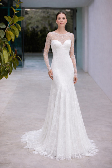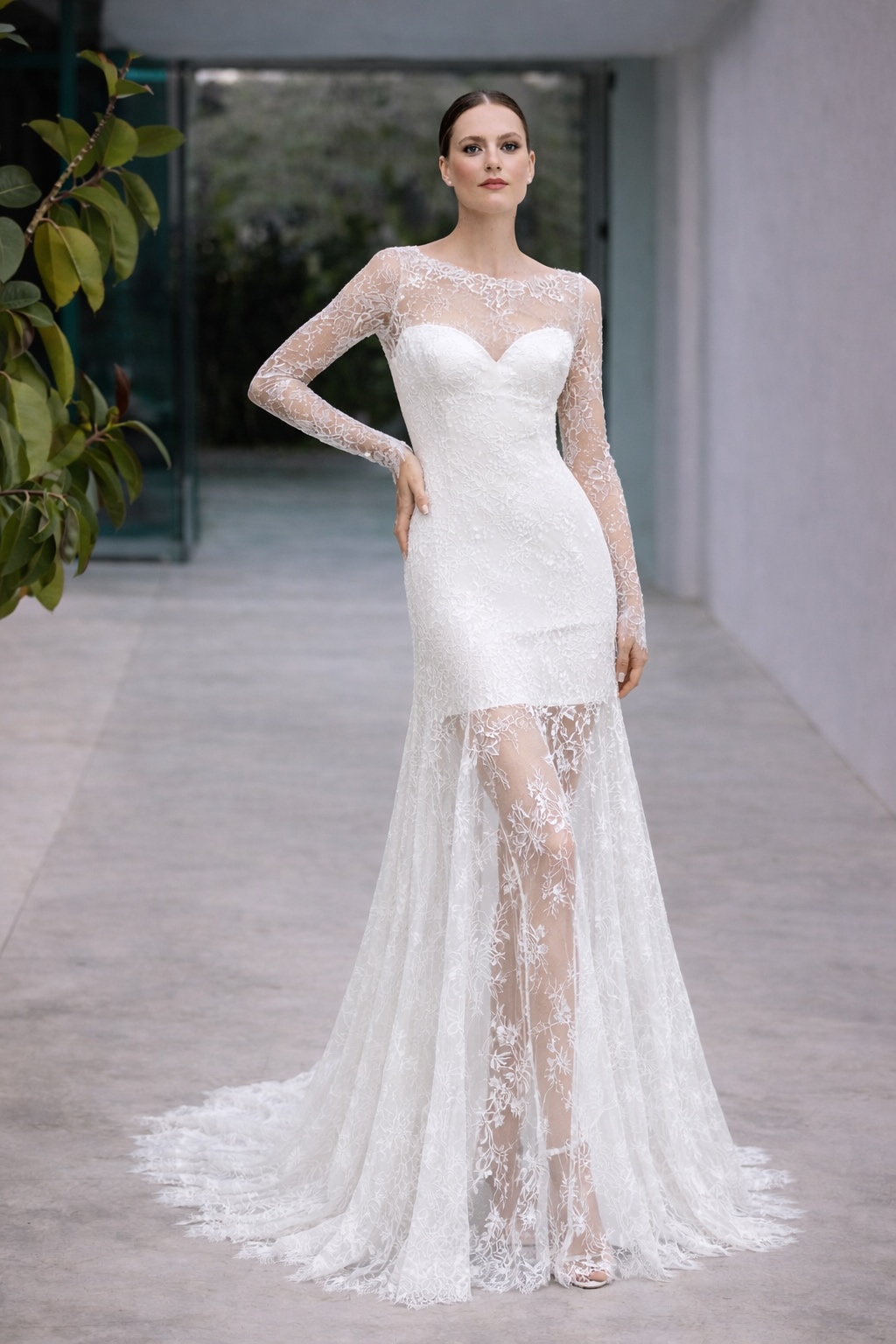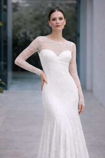 Krajková vrstva působí jako druhá kůže: transparentní, lehká a detailně zpracovaná, s jemným výstřihem, který zůstává elegantní a ženský. Po jejím sejmutí vynikne hladká linie spodních šatů, která krásně kopíruje postavu a působí moderně a sebevědomě. CIENY jsou ideální volbou pro nevěstu, která chce spojit emoci obřadu s uvolněnou elegancí večerní oslavy – bez kompromisů.