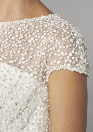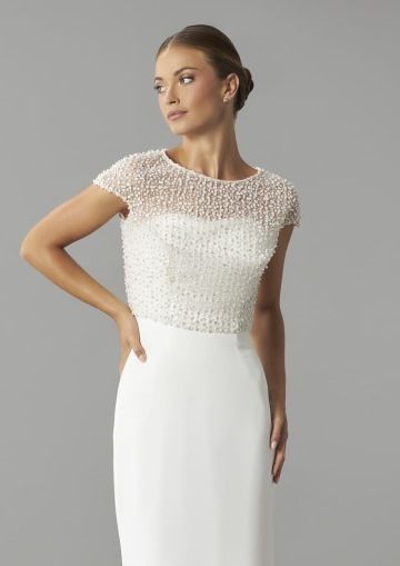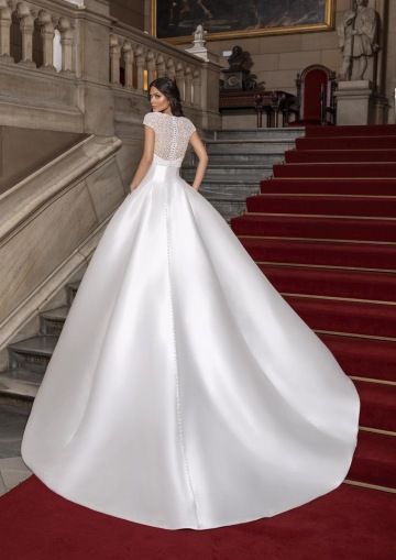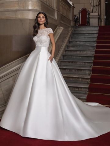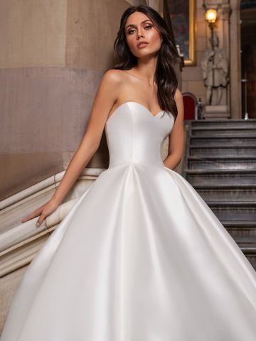 Tyto princeznovské minimalistické svatební šaty Pronovias CLOSE z luxusního mikada připomínají zlatý věk vintage couture s výstřihem ve tvaru srdce, který zvýrazňuje dekolt, a staženým pasem. Na obřad je zkombinujte s ozdobným bolerkem hustě vyšívaným perlami a kamínky a na začátku večírku odhalte ramena.