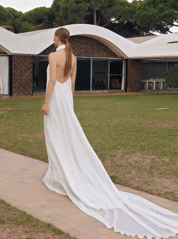 Vysoký halter výstřih ke krku přináší nádech sofistikovanosti a zároveň decentně prodlužuje postavu. Otevřená záda kontrastují s uzavřeným předním dílem a dodávají modelu smyslnost.