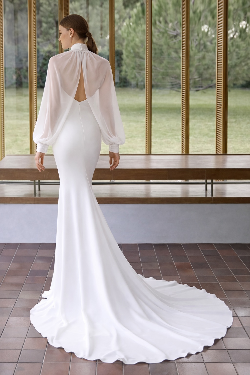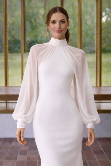 Vysoký halter výstřih ke krku přináší nádech sofistikovanosti a zároveň decentně prodlužuje postavu. Otevřená záda kontrastují s uzavřeným předním dílem a dodávají modelu smyslnost. Samostatné šifonové rukávy jsou perfektní doplněk pro obřad nebo na večer pro decentní zahalení ramen a paží.